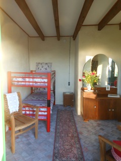 "In d’n juin"is een kleine zit-slaapkamer met stapelbed. Eigen douche en toilet. Beide kamers hebben openslaande deuren naar het akkerterras.