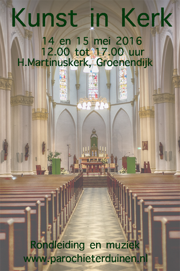In het (3e) weekend van mei, dit jaar op 14 en 15 mei 2016 is het weer tijd voor het jaarlijkse evenement Kunst in Kerk 2016. Net als vorig jaar presenteren meer dan 10 kunstenaars een selectie van hun mooie producties. Het eerste jaar in 2014 waren 7 kunstenaars p;resent, vorig jaar 12 en dit jaar zo mogelijk 15, waaronder Dieneke Covens, Sjaan Hamelink, Tos Sakowski, Karin Driessens, Francine Vermorgen! De succesvolle rondleiding door pastoraal medewerker Ralf Grossert staat ook beide dagen weer op het programma en dit jaar wordt beoogd het pas opgeknapte grote orgel (klassiek) te laten bespelen door niet minder dan Marcel Mangnus. Ook worden op groot scherm de foto's gepresenteerd van kerken van Oost Zeeuws Vlaanderen. Onder het genot van een kopje koffie/thee met zelfgemaakte cakes kan (bij mooi weer) zelfs op het kerkplein voor de kerk worden bijgepraat.